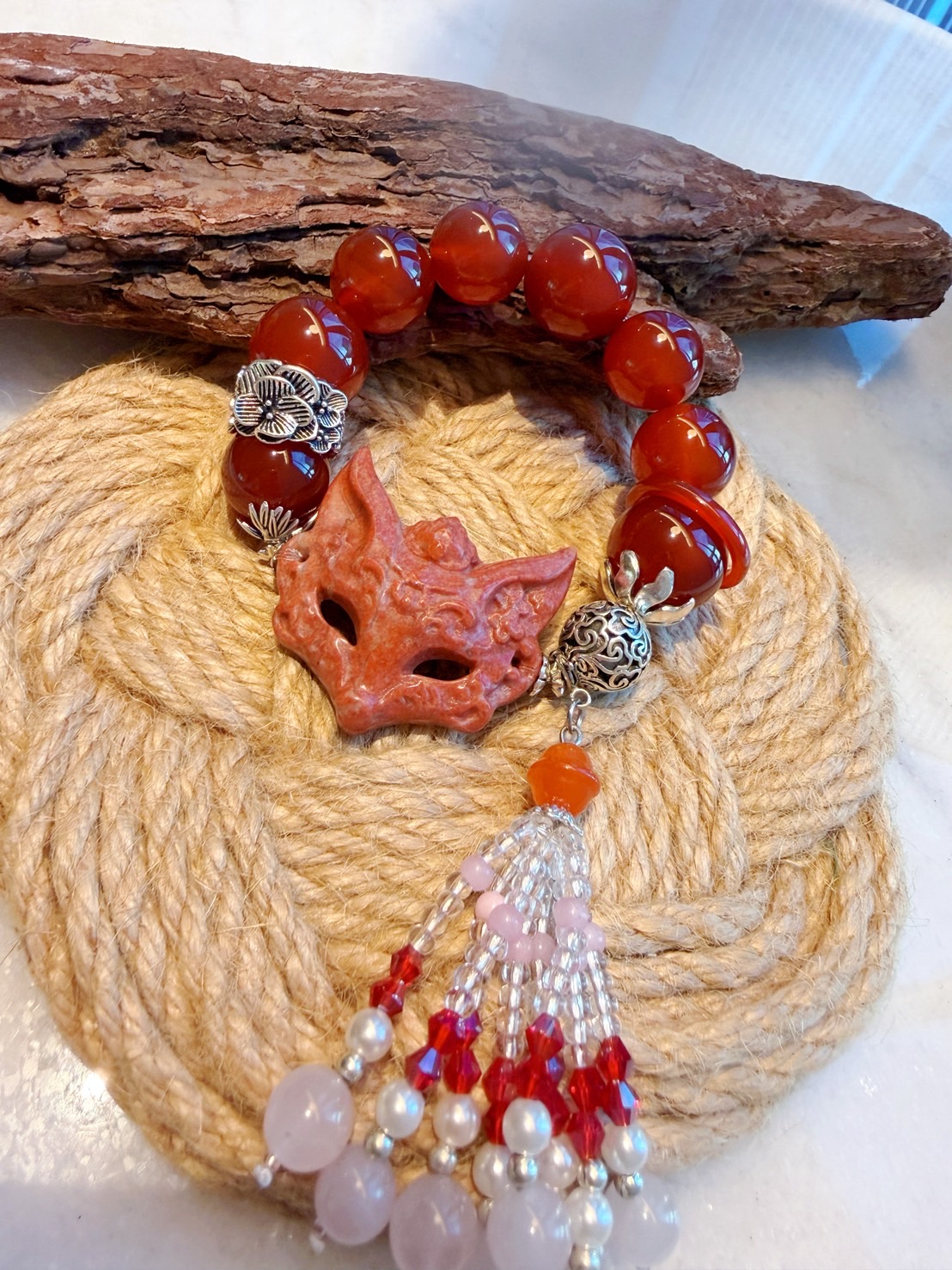 精品大顆粒🔥紅瑪瑙X粉岫玉面具狐仙/水晶手鍊